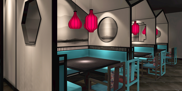 并將江南的水色山光,山嵐煙云,通過淡墨山水的形式移植進(jìn)餐廳的墻面,作為整個(gè)餐廳的背景,讓人仿佛置身江南的自然天地之間用餐,清新淡雅,心曠神怡!
