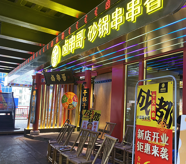 5、在鹵串哥的門店中,廣告裝飾成了門店最鮮明的一個風格。各種軟膜燈箱畫面、軟膜燈箱文案、發光字、立體字等,手繪墻,加起來100多項廣告制作,很好地增添了門店的熱鬧氛圍,傳達了品牌信息,形成了鹵串哥獨有的品牌體系,讓其他競爭者無法模仿。