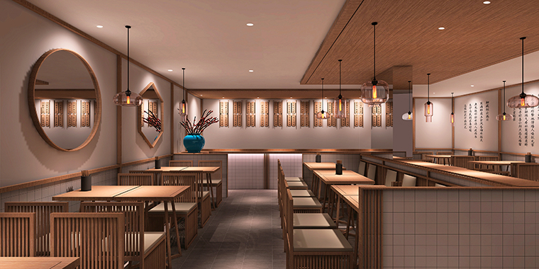 新中式簡約風格,我們將中國古色古香傳統元素簡約時尚化,使用原木、米色墻面增添質樸的氣息,輔以筷子、面條、瓷器、碗具等軟裝布置,在還原中式的同時,又貼合消費者的審美意向。